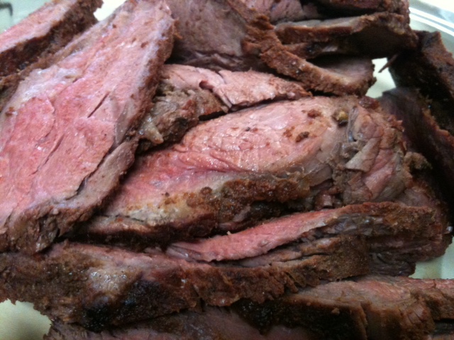 While the grill is getting hot, allow the beef to come to room temperature. When the coals have passed the hottest point and are on the decline (or turn your gas grill to low), begin to grill the beef. If you have a water reservoir to add moisture, use it. Turn the beef every 10 minutes or until the meat is medium rare – how long depends entirely on how big your piece of meat is. It took my two inch thick pieces of top round almost an hour to get to medium rare.