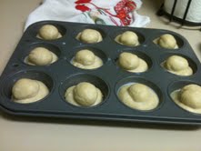Grease or spray muffin tins with Pam and place the large balls in the bottom. Using your thumb, make a deep indentation in the large balls and place the smaller balls in the indents. There is no need to press in, just set it there.