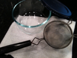 Choose a bowl with a lid – the one you will save the clarified butter in. You will also need a strainer that is smaller than the opening of the bowl and one piece of cheesecloth cut larger than the opening of the bowl.
