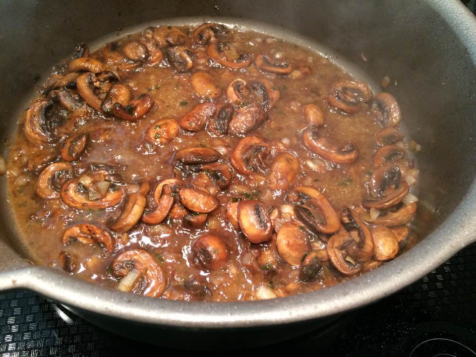 mushrooms simmering in a seasoned Madeira reduction