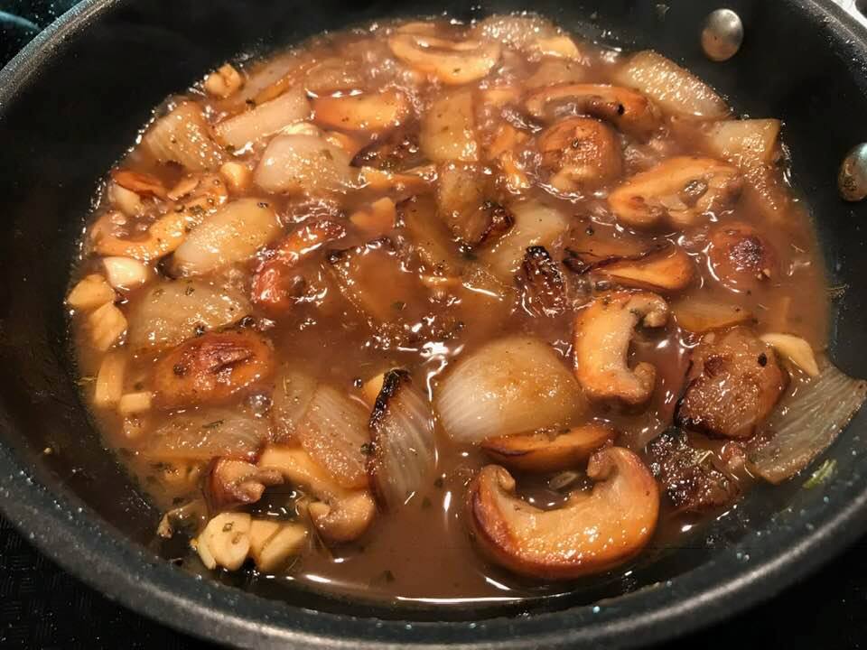 Add mushrooms and onions, sauté, stirring every now and then, until the onions and mushrooms brown and their liquids are released.