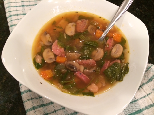 Mushroom, Sausage, White Bean, and Arugula Soup